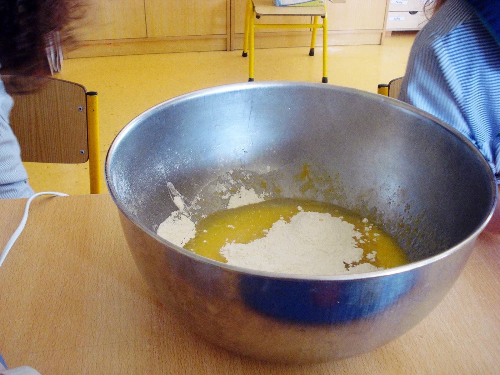 A semana passada fizemos um bolo de iogurte de banana, com a ajuda de todos.