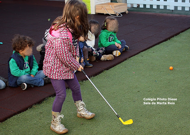 Na reunião da manhã, o Afonso mostrou um taco e bolas de golfe. Explicou como se jogava, mas de imediato surgiram outras sugestões sobre a melhor postura para jogar golfe.