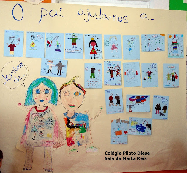 Primeiro, em grupo, escolhemos onze palavras para formar a área vocabular. Depois, cada um escolheu a palavra que considerou identificar melhor o seu pai e ilustrou-a.