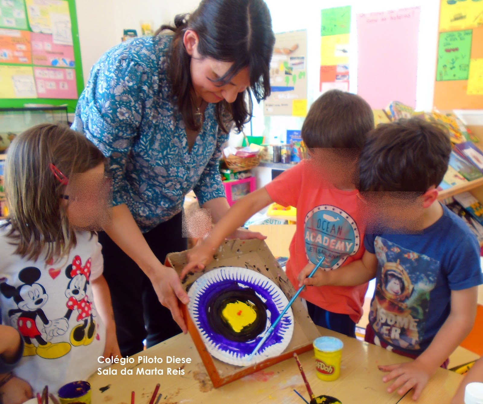 Fomos autênticos artistas em pratos de papel! Pintamos com linhas contínuas, salpicamos e giramos os pratos, escolhemos as nossas cores preferidos e criamos magníficas obras de arte...